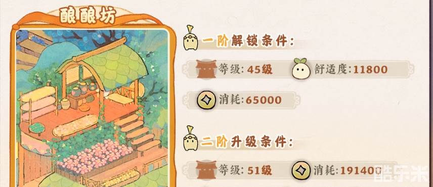 酿酿坊位于岩岩洞的左侧,一阶解锁[花酿拼调]小游戏,可以通过游玩[花酿拼调],通关时会获得福禄币奖励,计入福禄币周获取上限,达到上限后不再能获得福禄币。升级二阶可以增加300舒适度。