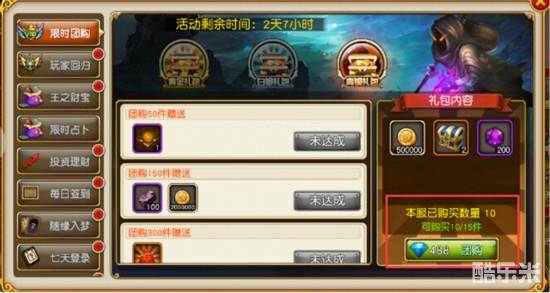 1.【限时团购】是一个全服团购活动,每次购买礼包都会累计本服购买的礼包数量。当本服购买礼包数量达到一定数量后,即可额外领取奖励。