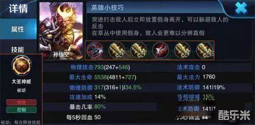 1、孙悟空,算是一个比较强力的战士,具有很强的突击能力,和输出能力、及逃生能力