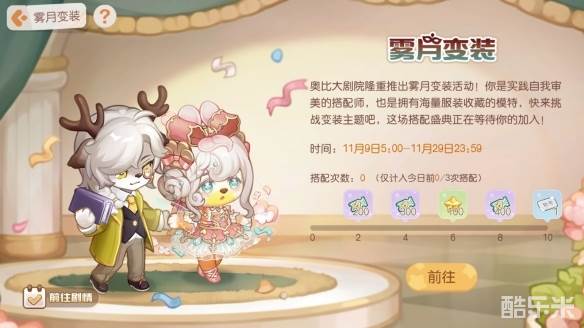 奥比大剧院要排一出新剧,剧团的造型师为演员搭配了好几身造型,这让马露难以抉择。于是他干脆在大剧院外设置了一个投票桌,邀请广大居民帮他决定。每期活动他都会作为主办方提供搭配主题,全岛的的造型师都可以参与其中。活动期间,小奥比们通过每日为他人搭配符合主题的装扮即可获得「雾月票根」,参与点赞评选就有机会获得「晶钻服装彩蛋锤」等奖励。将搭配好的装扮上传至排行榜,积攒点赞数,排名靠前的小奥比还可以获得本期限时限定称号「织绘时尚梦」「绚丽多彩秘旅」「闪耀梦幻之冕」。搭配出最棒的装扮,成为舞台上最亮眼的造型师吧!