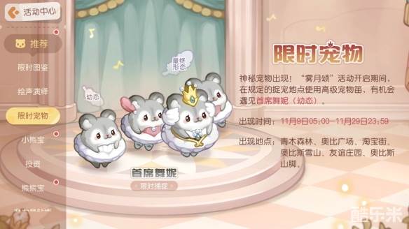 神秘宠物出现,活动期间限定宠物「首席舞妮」将会出现在奥比岛。前往岛内捉宠地点,使用高级宠物笛就有机会和它相遇哦。