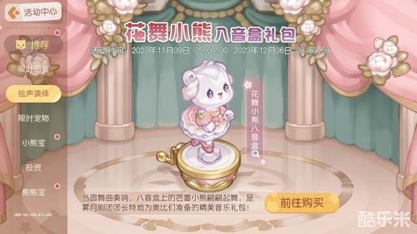 限时礼包「芭蕾音箱礼包」限时上架,购买可获得主题限定音箱「花舞小熊八音盒」,喜欢的小奥比们快快行动吧!