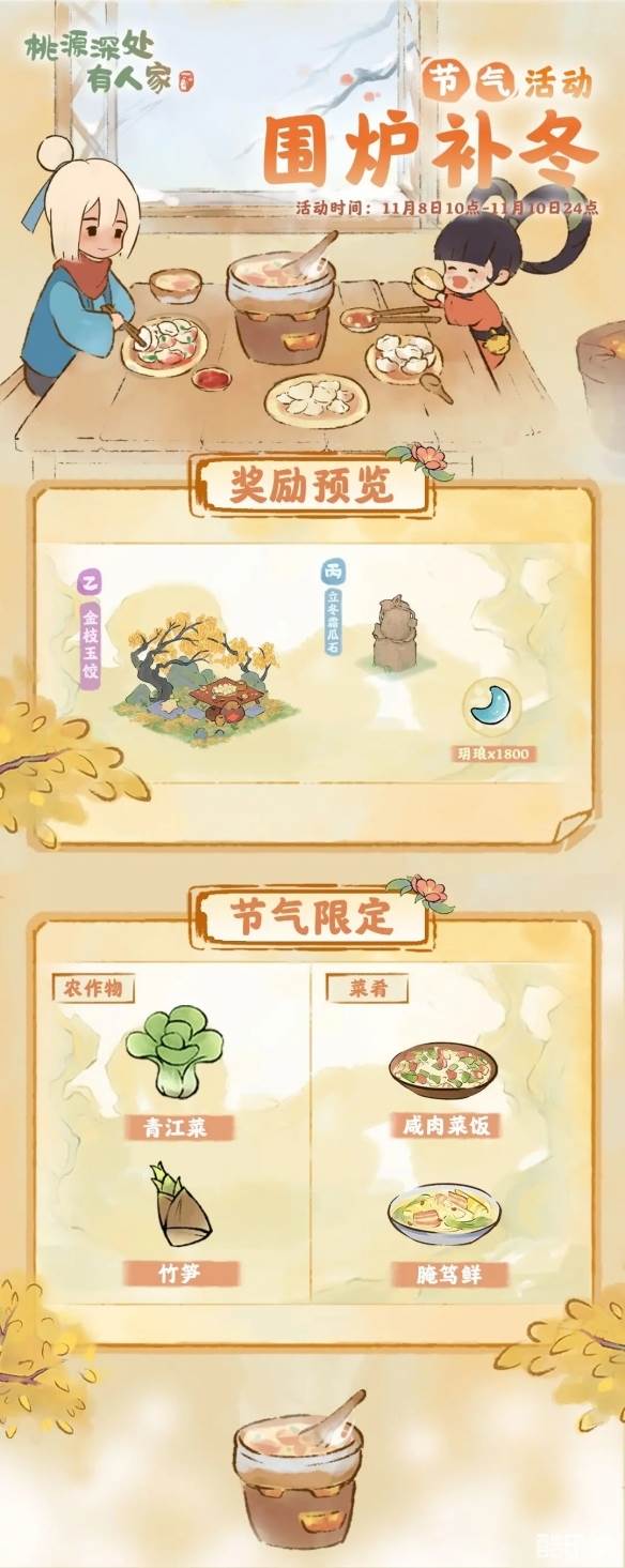 山民在活动期间内,可种植特殊农作物「青江菜」「竹笋」和制作特殊节气菜肴「咸肉菜饭」「腌笃鲜」,提交节气订单可以额外获得玥琅。萝萝山已准备好了本期的节气限定建筑,山民记得参与活动获取玥琅,不要错过兑换时间萝!
