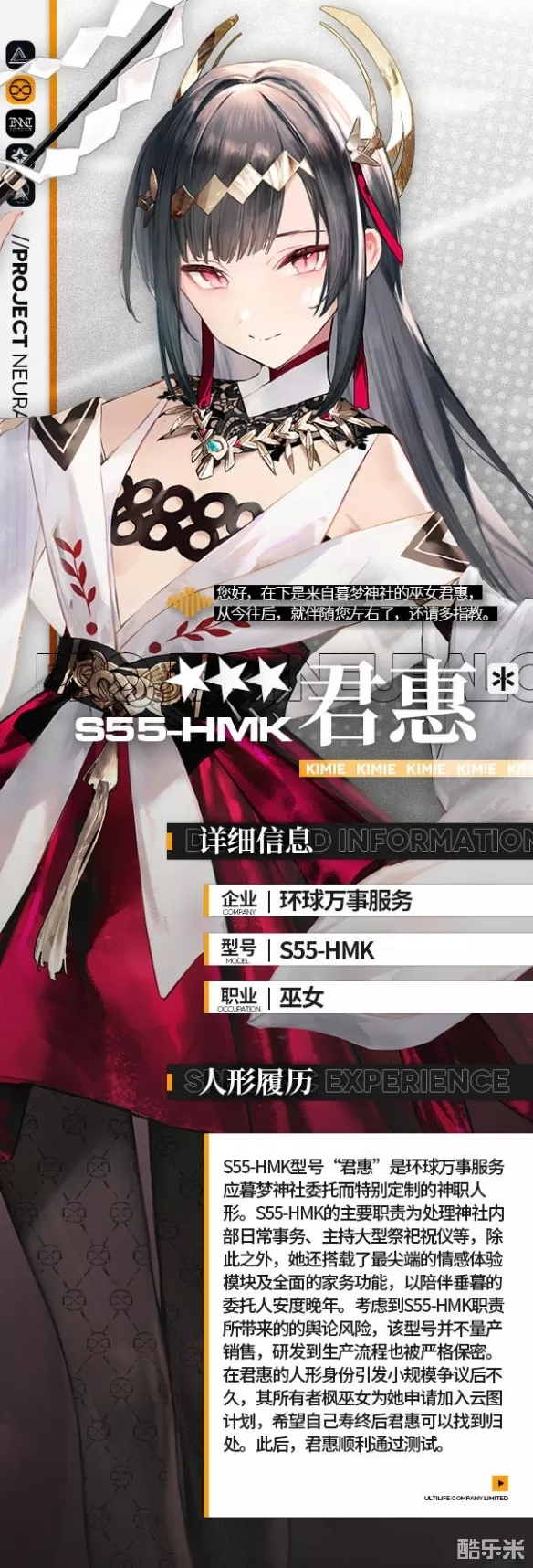 S55-HMK型号“君惠”是环球万事服务应暮梦神社委托而特别定制的神职人形。S55-HMK的主要职责为处理神社内部日常事务、主持大型祭祀祝仪等,除此之外,她还搭载了最尖端的情感体验模块及全面的家务功能,以陪伴垂暮的委托人安度晚年。考虑到S55-HMK职责所带来的的舆论风险,该型号并不量产销售,研发到生产流程也被严格保密。