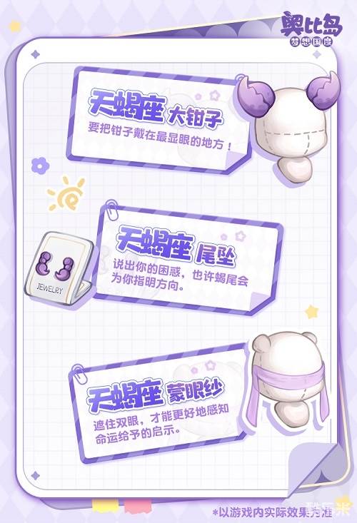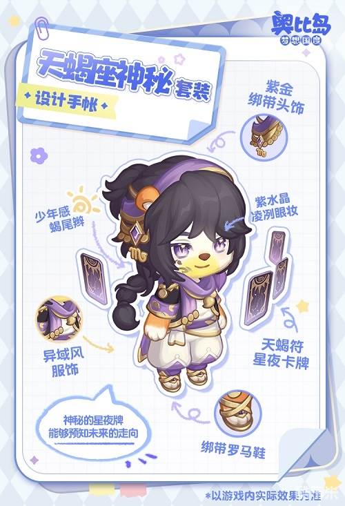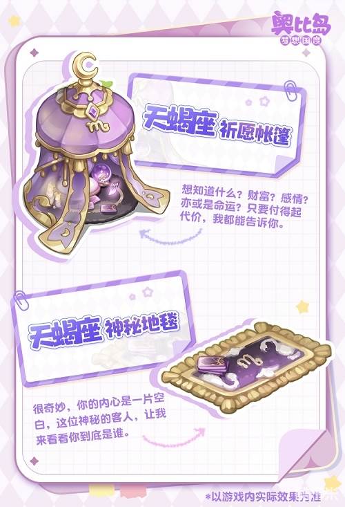 本次时装整体以幽紫为主色调,在套装的发型、服装、首饰和装扮散件上均加入了具有天蝎座特色的符号元素,水晶球、星夜卡牌……赋予了天蝎座预知未来的能力。此外,还有天蝎座主题同款家具,被烛光、水晶球围绕的祈愿帐篷和有着天鹅图案的金边软毛地毯,让天蝎座更具神秘氛围感。