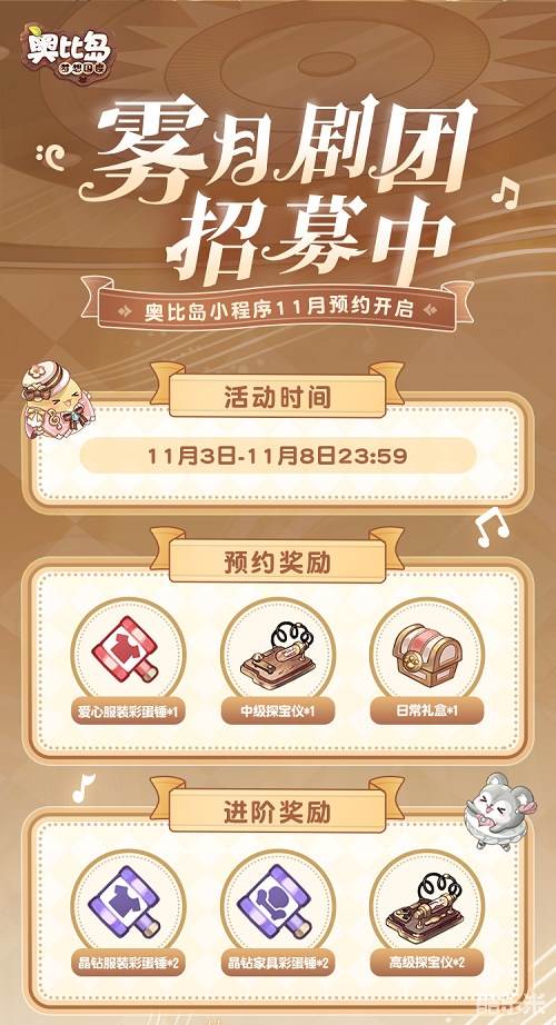 11月3日-11月8日23:59期间,成功预约新版本,加入雾月剧团,即可获得「爱心服装彩蛋锤*1+中级探宝仪*1+日常礼盒*1」,成功召唤3位小伙伴一起预约,还可获得进阶奖励「晶钻服装彩蛋锤*2+晶钻家具彩蛋锤*2+高级探宝仪*2」!