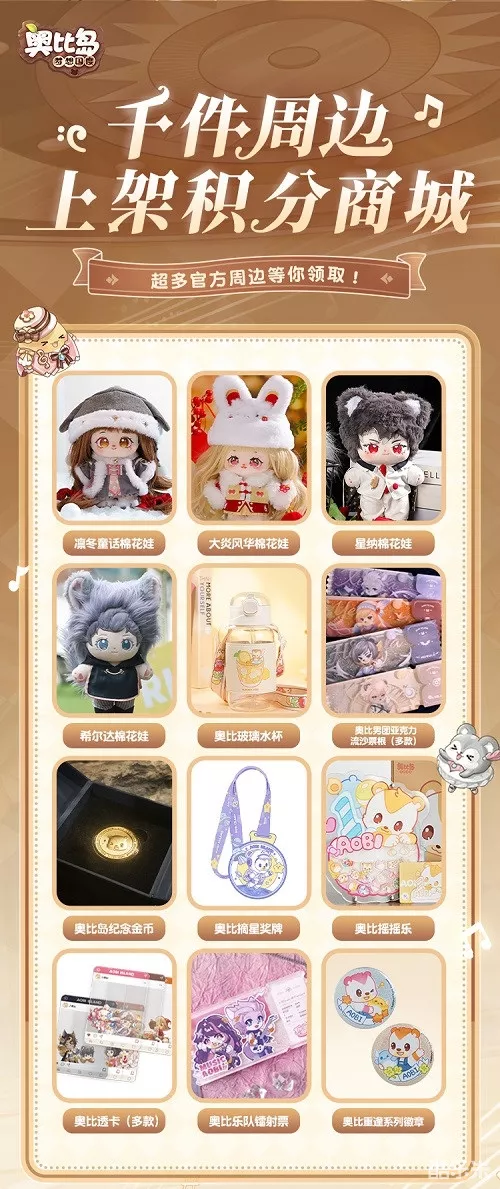 小程序积分商城将上架「凛冬童话棉花娃」「大炎风华棉花娃」「星纳棉花娃」「希尔达棉花娃」「奥比玻璃水杯」「奥比岛纪念金币」「奥比透卡」等多款周边。