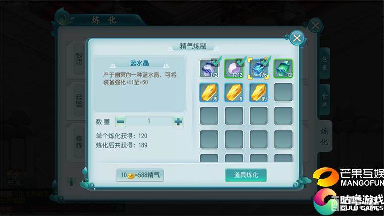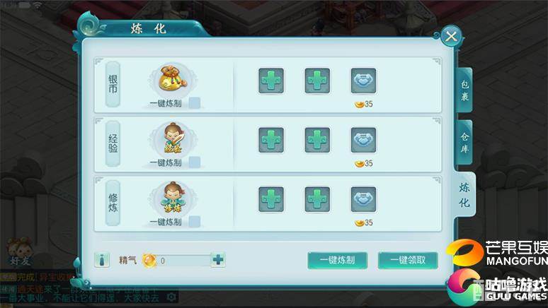 点击精气右边的加号可以兑换精气值,玩家自行选择将暂不需要的道具进行精气炼制。无需等待即可换取等额精气值。精气是炼化的核心资源物品,有了精气值玩家就可以炼化经验、银币以及修炼丹。