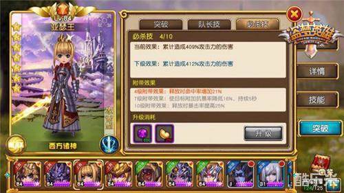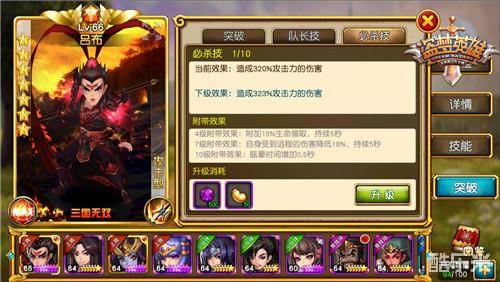 技能突破开启初期,必杀技的等级默认为0级,每升一级都会在0级属性上做对应提升。4级及之后每升3级(即4/7/10级)会获得额外能力,比如战斗时临时提升属性、附带克制效果等,最多提升到10级。和天赋技能一样,在英雄界面可以实现必杀技升级面板的切换,必杀技升级需要消耗相应数量的进化石、仙豆。