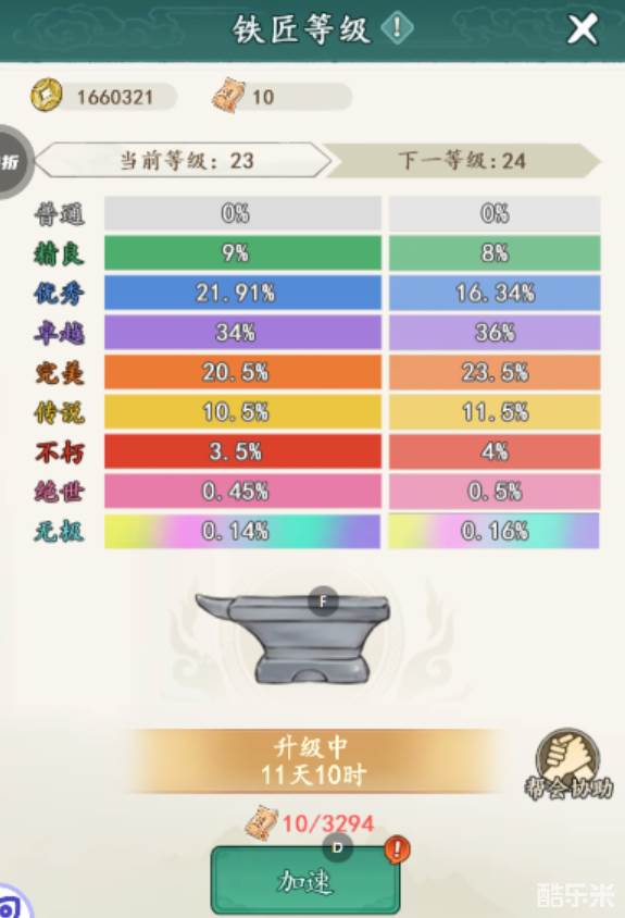这游戏第一天铁匠21级左右是可以直接产出无极装备的,前期啥也别管,嗷嗷打铁升级,先升级铁匠等级,再配合充值豪礼里面的铁匠礼包,鉉铁去升级,第一天直接一身无极套没啥问题,因为这是0.1折版本,100 都花不了。直接用元宝买加速买铜钱升级铁匠就行了,这个越早拉等级越好。
