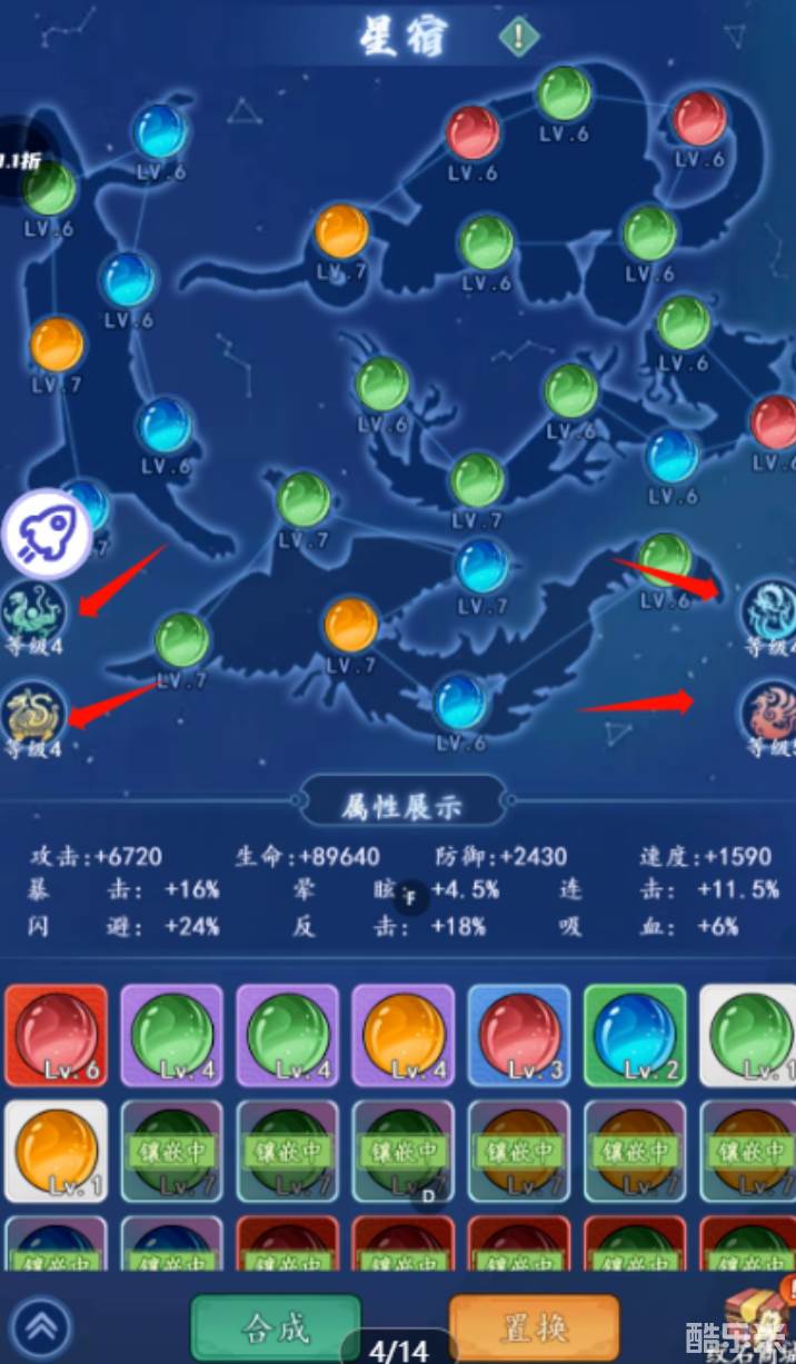 星宿有四象,每个有6个孔,综合等级有衰装效果。