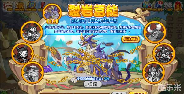 1.洛克王国裂岩蓄能活动左右分布着六只宠物,小洛克们可以先击败这些BOSS,解除锁链打开封印,再进行裂岩卡秋莎的挑战。