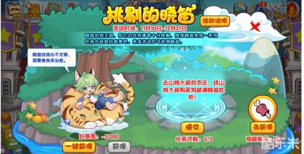 1.洛克王国挑剔的晓笛活动每天有三次提高好感度的机会,小洛克们根据任务提示,完成后根据表现获得好感度,我们分成以下几种情况讲解。