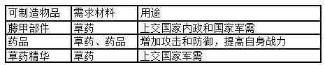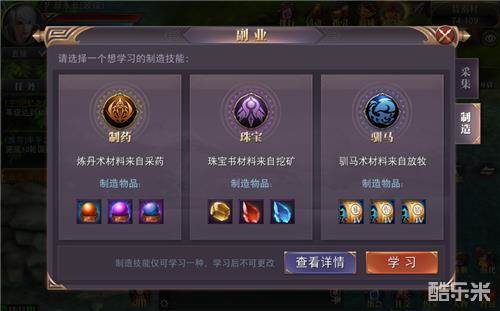 制造包含三种:制药、珠宝和驯马,每个玩家只能选择其中一种学习。制造需要采集获得的材料加上活力来制造物品。