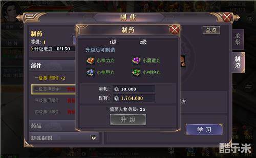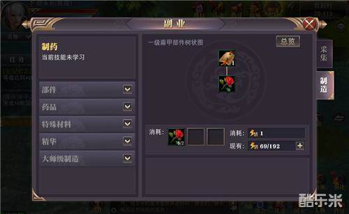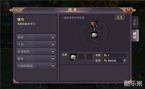 制造学习后是一级,只能制造一级的部件,每造一个部件,便会获得一定的熟练度。熟练度达到升级要求,便可以升级,升级后可以制造更多的物品。此外,只有造黄色和绿色配方的物品才会涨熟练度。合理的分配活力是提升制造等级的秘诀。