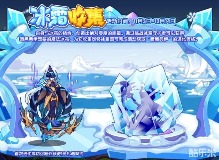 自身与冰霜的结合,创造出绝对零度的能量。通过挑战冰霜守护者可以获得暗黑典伊想要的魔法冰霜,为它收集足够冰霜即可完成活动获取“暗黑典伊”的进化资格。