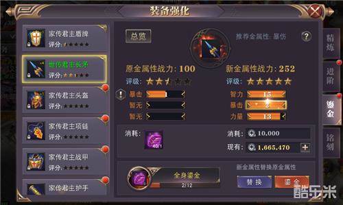 通过对装备进行鎏金,可以随机获得1~3条属性。可以根据当前鎏金的属性评分和战力值,来判定属性价值。
