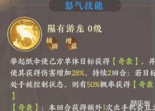 扶苏属于绝品门客,自身资质12点,中规中矩的属性但是在辅助方面能力却非常高。主动技能是很简单的单体伤害类型。选择前排单个目标,造成中等程度的输出。怒气技能举起手中纸伞,使我方单体目标获得奇袭状态,并且接下来两个回合里造成的伤害大幅提升。如果我方被作用目标处于被控制状态,得获得奇袭几率降低到50%。