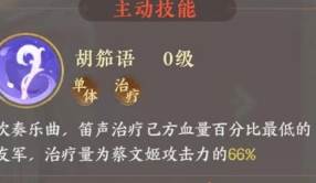 怒气技能将手中笛子挥舞起来,为血量百分比最低三个目标进行治疗,同时为所有治疗目标添加疗伤效果。该效果在持续的两个回合里,每回合都能自动恢复血量,恢复数值和蔡文姬攻击力相关,按照比例折算。这两个技能也就意味着,蔡文姬在单加和群体治疗方面都有很好表现,虽然不是全体目标一起加血,但是三个目标也已经能做到绝大多数覆盖,而且是血量最低的三个,这样实用性更强。所有恢复血量加上疗伤被动回复,叠加起来在总量上也很可观。