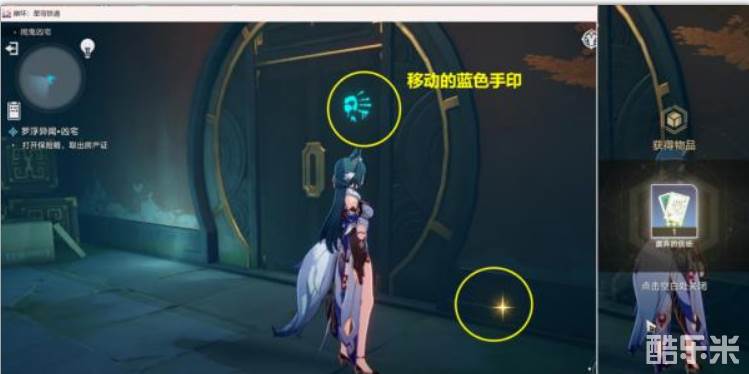 13.上图提交方形饭团后,旁边墙上会出现不断移动的蓝色手印,然后来到下图墙底下位置,调查一下发光点后,可获得废弃的信纸。