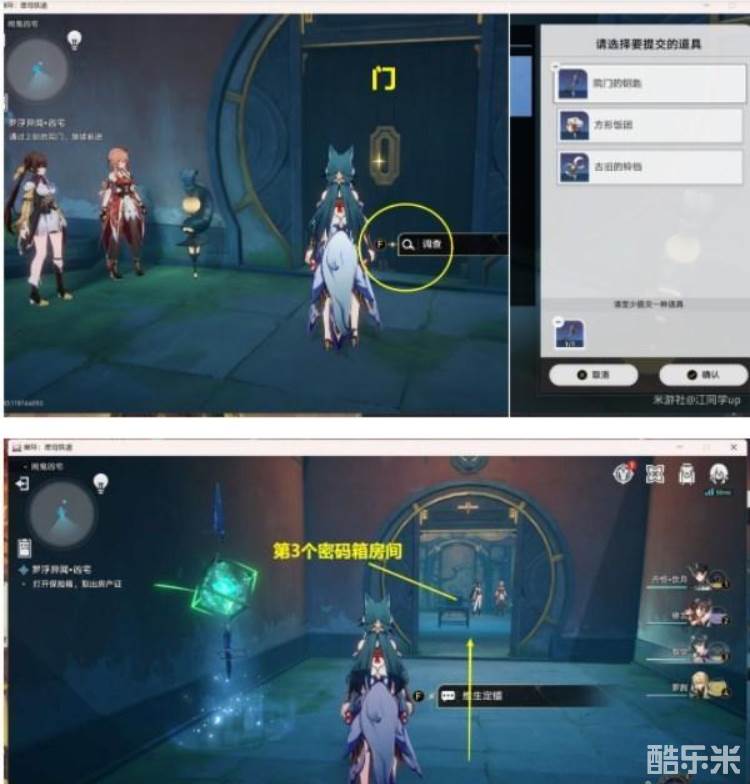 11.到下图第3个有密码箱的房间后,先调查右上角地上的箱子,然后提交古旧的铃铛。