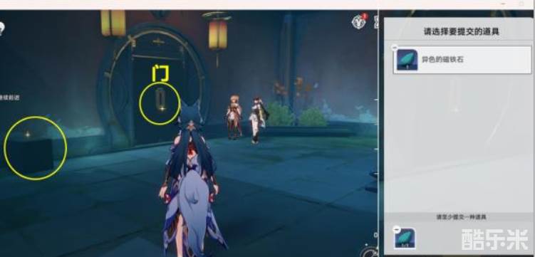 4.进入第1个有石碑的房间后,先调查左边地上的箱子,然后提交异色的磁铁石,会获得打开左边门的院门的钥匙。