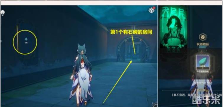 3.进入副本后,先左边墙上调查2次后,可获得异色的磁铁石,然后进去前面第1个有石碑的房间 ,这个房间后面还需要返回来解密,所以大家提前知道后,有个印象就行。