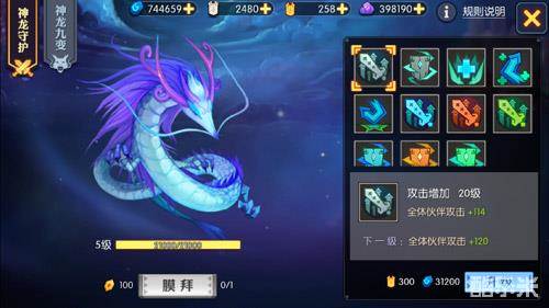 随着神龙等级的提升,将开放神龙守护技能。神龙守护技能容易被忽略,利用黄玉牌对相应属性进行提升,可以给伙伴提供属性加成。神龙等级越高,可以升级的技能数量越多哦,所以需要先培养好神龙,多多开放守护技能数量。