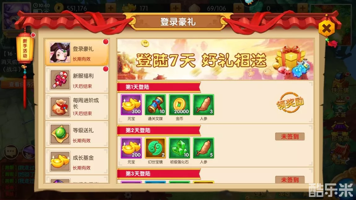 3、在活动界面通过登陆豪礼、新服福利、等级送礼、成长基金等选项领取奖励