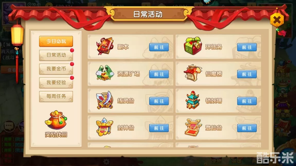 5、达到指定等级后还可以解锁日常副本,我们可以通过资源矿场、仙魔榜、练武台等副本获得元宝