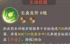 主动技能效果为单体伤害类型,将手中药水应向选中单个目标,造成少量伤害之后有几率使目标获得一层不良状态,该效果能持续两个回合。此状态最多可以叠加到5层,每层都能按照目标当前最大生命值计算,损失一定比例血量。对方血量越高,掉血也就越多。如果能叠加到5层,则每回合都会损失25%血量,当然不能超过扁鹊500%的攻击力。