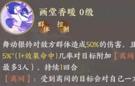 相比之下,妲己就要略微逊色些,主动技能仅能降低伤害目标敏捷属性,怒气技能虽然也能控制住三个目标,但是仅是有几率触发眩晕,眩晕之后最多无法行动,不能和离间这样,反过来帮助输出。但依然属于最适合选择的类型之一,特点是当自身阵亡时会降低攻击目标大量敏捷与攻击力,相当于直接废掉一个单位。