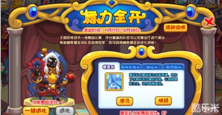 5.四支队伍一同学习挑战下来可以拿到32分;既然说到舞蹈评分,那么我们最终目的就是需要赫斯提亚在四支队伍中夺得头筹,拿下舞蹈评分之最,就能开启:赫斯提亚进化资格啦。