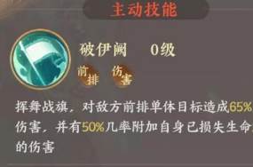 从定位效果来看,白起防御属性非常出色,天生就适合站在前排去吸收伤害,技能效果也说明了这点。主动技能是挥舞手中战旗,伤害对方前排单体目标,同时有较高几率将自身已损失生命值按照比例加成为伤害,同样输出过去。达到三星时不仅伤害比例提升,附加伤害也能达到自身已损失生命值30%,也就相当于白起当前血量越低,主动造成输出也就会越高。