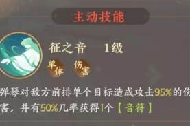从该角色属性图来看,不仅攻击方面出色,防御也并不算太低,主动技能效果为使用手中古琴伤害敌方前排单个目标,在造成伤害之后还有几率获得音符。音符作为高渐离自身独特状态,在后面一些技能中起到关键作用,另外该技能伤害比例达到三星是为100%,和其他角色相当。同样可以获得音符的还有怒气技能长歌送魂,奏起乐章伤害敌方前排所有单位,造成一次高额伤害后,可以随机获得1~2个音符。角色升到4星时伤害比例提升至180%,已经是非常可观的输出。