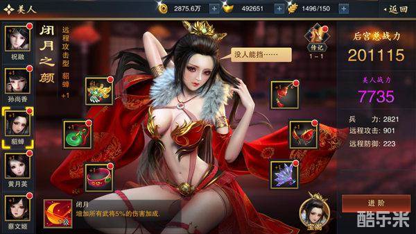 每一位美人都拥有着自己的属性,例如祝融夫人就是近战进攻型,在提升兵力的同时,可以增强近战的攻击与防御;而闭月之颜貂蝉属于远程攻击型,则可以在提升兵力的同时增加远程的攻击与防御。在主公实力提升的同时,我们也可以给美人进行进阶,增强美人的基础属性以及美人的技能。