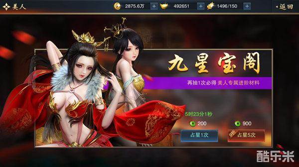 想要激活美人系统中的美人,则要收集齐六种道具,可以通过日常任务来获得,也可以通过九星宝阁来占星得到。美人还拥有自己的独立传记,通关章节后便可以获得美人进阶的道具,让喜爱的美人在战场上也所向披靡。