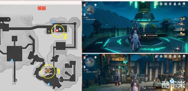 6、接下来先根据任务指示,进入到前面的【迷宫】里面,在下图1和2位置【站立】一下,然后出来后,继续和【符玄】对话,第3次解密执行指令如下图