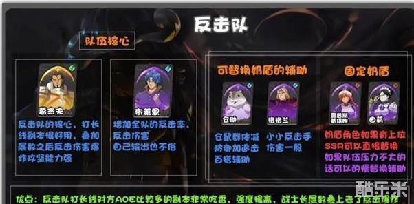 这个阵容反击队打长线对方AOE比较多的副本非常吃香,强度很高,战士长层数叠上去了反击爆炸。缺点是短线比较疲软,对面AOE较少的情况下很难触发反击。