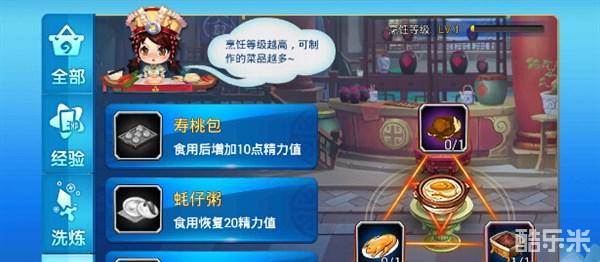 玩家可以通过点击客栈中的【阿奴】,进入烹饪界面,在这里烹饪出的食物一共分为三类,它们分别是可以增加角色当前经验值的【经验类】;培养角色属性,增强战力的【洗练类】;以及回复体力值和精力值的【其他类】,而在上次测试中,其他类菜品的作用是增加战斗增益BUFF。