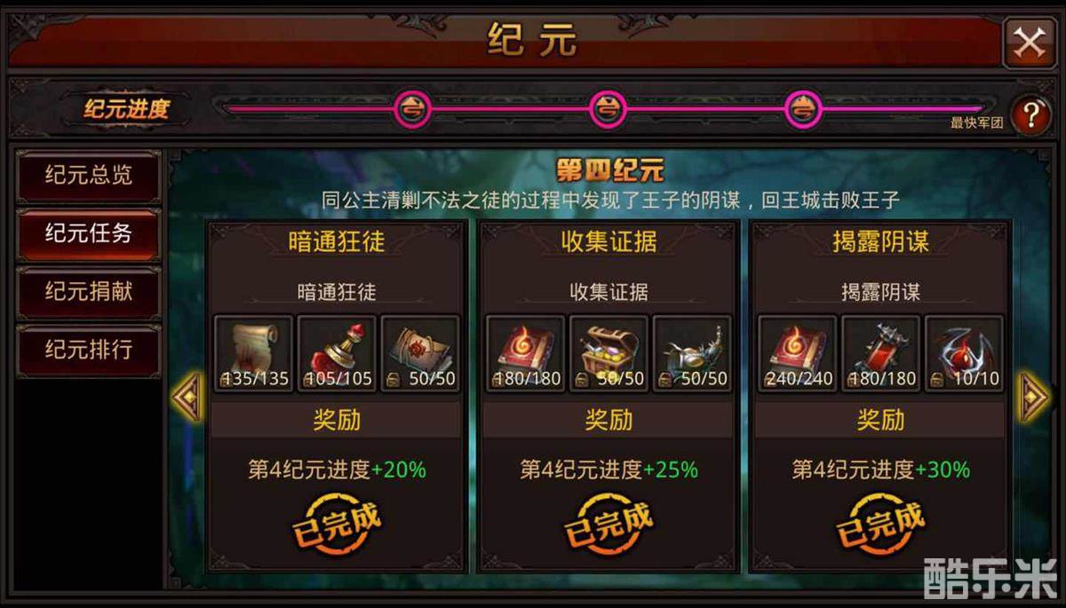 参加过军团纪元的玩家都知道,每个纪元分为四个阶段,每个阶段包含若干纪元任务,而且纪元任务均为道具捐献类任务,玩家需要在冒险时收集相应道具,然后在军团系统中进行提交,在整个军团累积的任务道具达到任务要求后,就可以完成纪元任务。