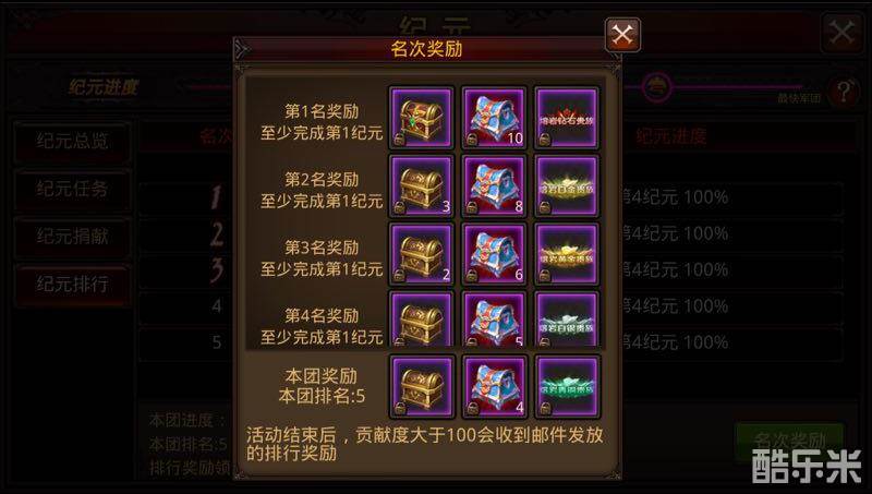根据纪元进度的快慢,军团间会有纪元进度排行,纪元活动结束后,根据排行榜军团成员可以获得排行奖励。奖励中不仅有着丰厚的资源,更有在纪元中才能获得的独有的贵族称号,“熔岩钻石贵族”、“熔岩白金贵族”、“熔岩黄金贵族”、“熔岩白银贵族”、“熔岩青铜贵族”所以为了那更丰厚的奖励与无上的荣耀,各位勇士请奋力前行,向大陆的勇士们证明自己的军团才是最强军团。