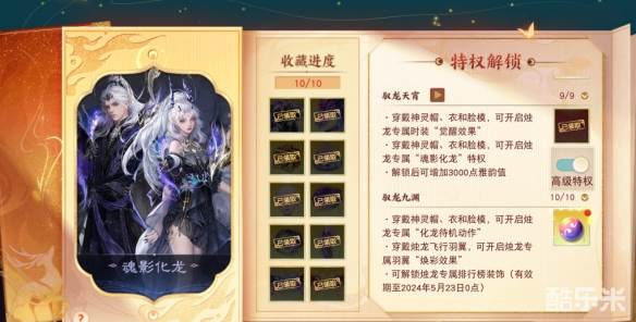 完成当期十件神灵外观收藏进度后,【驭龙九渊】特权解锁魂影化龙的效果将进行升级,不仅能够将少侠们化龙后的移速提升至与飞行翅膀速度一致,同时还将开启化龙专属【待机动作效果】!
