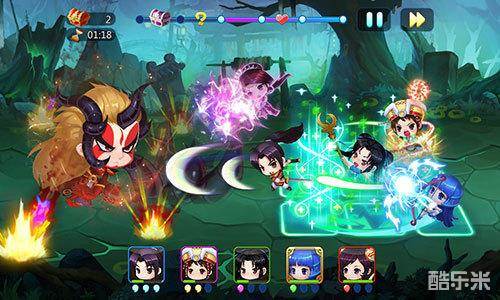 战斗开始后,左方会刷出怪物向右方进攻,右方玩家控制角色站位,当怪物进入警戒范围,角色会自动进行普通攻击。战斗中会出现不同系的技能转珠,当角色收集够转珠,点击相应角色头像可对应释放技能。一波结束后,角色会自动前进,进入下一波战斗。