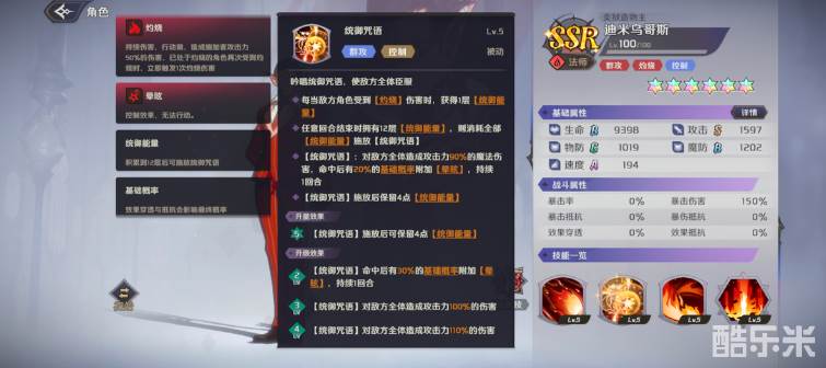 -[统御咒语]:对敌方全体造成攻击力90%的魔法伤害,命中后有20%的基础概率附加[晕眩],持续1回合