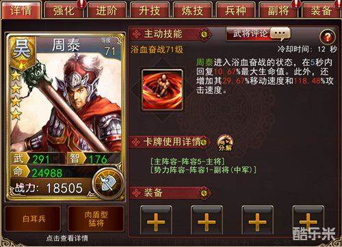 周泰作为吴国R品级武将,实力非凡,步兵兵种的他,有着高额的生命成长,可以充当我方部队的领头先锋。技能浴血奋战可以在5秒内回复自身一定生命值,并且增加自身移动速度与攻击速度。一旦技能开启,周泰将从一个坦克变成一个恐怖的输出机器!分分钟暴打敌军。
