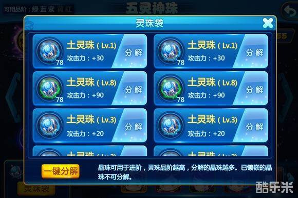 当然,拥有很多低级灵珠或者暂时没用的灵珠可以用来分解成晶珠,分解得来的晶珠可以用来提升现有装备上的灵珠等级。