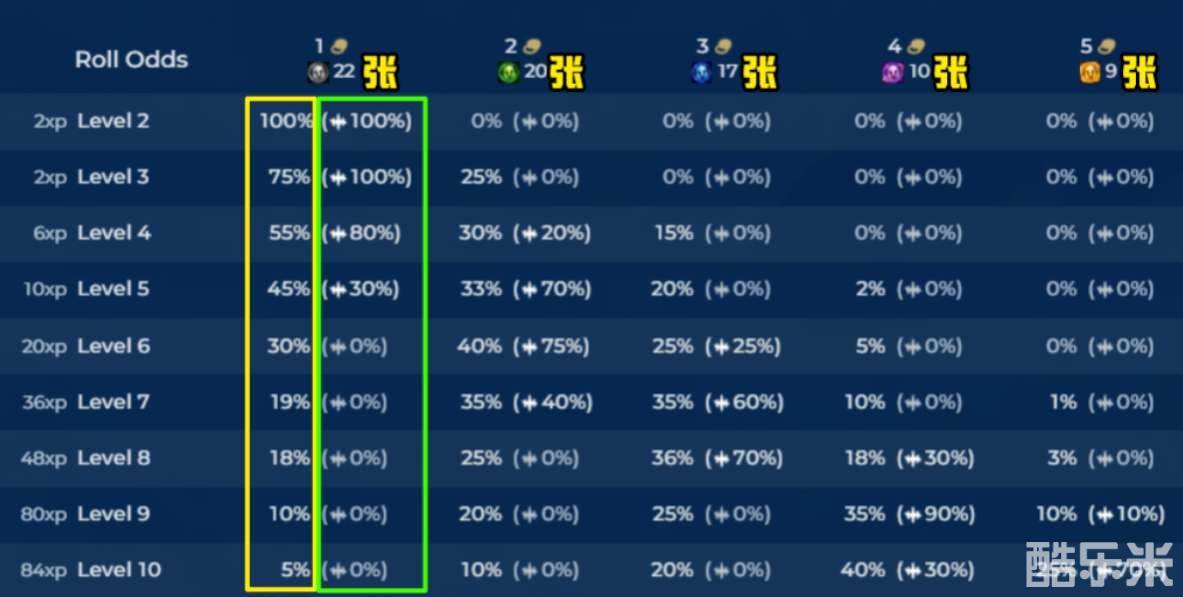 1、s10天选弈子各个等级的刷新概率如下图所示:黄色框内为该等级下弈子刷新的概率,绿色框内为天选出现的概率。