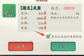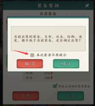 刚进入游戏根据指引完成锻造并且穿上装备(PS:当出现新装备的时候图二的选项玩家可以勾选意思就是出售掉原本身上的装备;假如出现更高级的装备玩家不小心点击装备时也会跳出第二个弹窗让玩家二次确认是否要出售原来自身的装备,这里图三的选项不建议玩家勾选,防止不必要的损失)