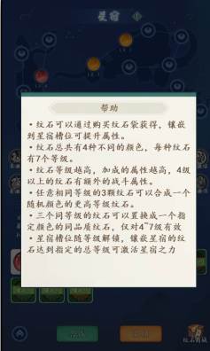 在玩家解锁星宿玩法之后可以查看上方帮助按钮查看该玩法,玩家可以通过该玩法右下的纹石商城购买纹石并且不断升级纹石提高属性(PS:单击已装备的纹石即可卸下该纹石)